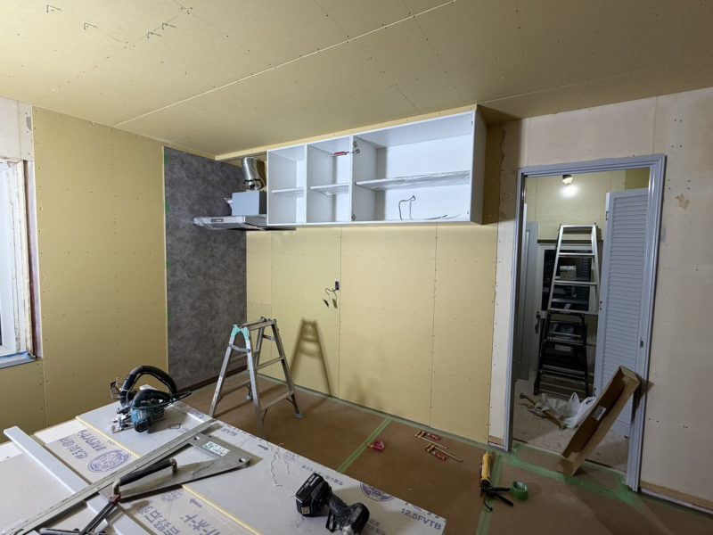 吊り戸とレンジフードを設置します。